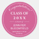 Este adesivo de formatura é perfeito para o formando da turma de 2025. Este design apresenta um fundo rosa simples e moderno e festivo com texto branco personalizável para colocar o ano da turma, o nome e o nome da escola.