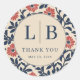 This wedding sticker features a circular design with a symmetrical floral pattern, combining soft beige, rich navy blue, and vibrant coral red colors. The central circle showcases elegant serif typography, expressing gratitude in a formal yet approachable tone. Surrounding the text are stylized daisy-like flowers and elongated leaves, creating a modern vintage charm perfect for celebrating special occasions. Ideal for adding a touch of sophistication to wedding favors or event acknowledgments, this sticker conveys warmth and appreciation through its harmonious color palette and intricate botanical motifs.