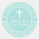 Uma bela sombra de verde-claro cria um adesivo bonito para muitas ocasiões religiosas como batismo, batizar, dedicação, primeira comunhão ou confirmação. Ele apresenta uma faixa e um impressão floral nos mesmos tons de azul e branco. Uma pequena cruz está no centro do círculo azul. Obrigado e o nome do garoto está abaixo. É fácil personalizá-lo.