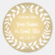 Adicione um toque final personalizado aos brindes de festa e bilhetes de agradecimento com adesivos redondos personalizados de coroa de louros. Todo o texto neste modelo é simples de personalizar para qualquer ocasião, como casamento, chá de noiva, formatura, festa de aniversário, aniversário de casamento ou aposentadoria. Altere ou exclua qualquer um dos textos para criar selos de envelope para convites, anúncios ou save the dates. O design botânico moderno apresenta uma coroa de louros branca em um fundo dourado de pseudo-folha metálica, caligrafia rústica e tipografia clássica elegante. Por favor, note que o dourado é uma cor impressa, não folha metálica. Esses rótulos redondos elegantes adicionam um toque único e personalizado à celebração de um dia especial.