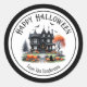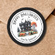 Dê alguns favoritos para festas adoráveis aos convidados numa festa anual de fantasia de Halloween, ou qualquer evento com este adesivo simples e divertido. Um simples visual preto e branco, que tem uma mistura de tipografia simples e escrita. Uma casa assombrada a preto e branco com sotaques laranja de uma árvore, abóboras e jack ou lanternas. Alguns sotaques de fantasmas e morcegos para fora da diversão. Vinheta-redonda clássica do partido Feliz Halloween Halloween
