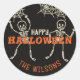 Os adesivos do Dia das Bruxas apresentam esqueletos bonitos e teia de aranha sobre fundo preto. Esta design combina com os suprimentos da festa do Dia das Bruxas nesta coleção.