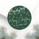 Festive Holiday Round Sticker. This cheerful round sticker features a doodle swag of pine greenery and hanging ornaments along the top, with scattered star doodles adding a playful touch. Set on a deep emerald green background, “Merry Christmas” appears in elegant sage green script near the center, while a name or line of text is displayed at the bottom in a clean sage green font.