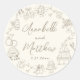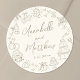 Personalized Hand-Drawn Quirky Wedding Stickers. These fun and playful round wedding stickers feature quirky doodle illustrations surrounding the edges in soft tan against a crisp ivory background, creating an elegant, muted look. Elements like a champagne tower, wedding cake, disco ball, hearts, wedding bells, rings, cameras, and more are rendered in tan linework, giving the stickers a whimsical yet refined vibe. The bride and groom’s names and wedding date are elegantly displayed in the center in a mix of handwritten script and simple fonts, also in coordinating tan tones, adding a stylish and personalized touch.