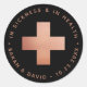 Um adesivo para o Kit de Emergência (também conhecido como Kit Hangover) para colocar em um saco de boas-vindas ao casamento, com algum dentro de remédio. Ele tem uma cruz rosa dourada (faux) no centro e o texto arquivado fazer um círculo ao seu redor. O fundo é preto. Por cima, há a mensagem "Na doença e na saúde" e, por baixo, há os nomes da noiva e do noivo e a data. O texto está em pequenos bonés cor-de-rosa, semelhantes ao rosa da cruz.