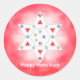 Fique com a minha design da Estrela de David e pequenos flocos de neve coloridos em um fundo vermelho e branco. O texto diz "Feliz Chanucá".