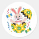A super fun and festive illustration of a cute bunny with a bow tie popping out of a yellow floral egg, surrounded by colorful candies and confetti. This joyful design is perfect for kids' Easter party favors, laptop stickers, and festive magnets. Celebrate the holiday with a burst of color and sweetness!