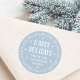 Winter holiday stickers featuring the text "Happy Holidays" in a white festive font with your custom text below. Around the edge is a wavy, cute dot border and retro stars. Light dusty blue background.