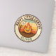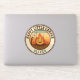 Este adesivo personalizado e divertido apresenta uma fogueira sorridente com um marshmallow em um bastão, colocado sobre um fundo retrolistrado de cores do pôr do sol. A design é fechada num crachá circular com o texto "HAPPY LITTLE CAMPER".