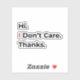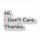 Add attitude to your laptop, notebook, or water bottle with this minimalist sticker featuring the sarcastic phrase “Hi. I Don’t Care. Thanks.”