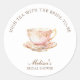 Elegant bridal shower round sticker featuring a pastel teacup illustration with gold accents paired with serif and script fonts in which your personalized information is written in. Check out our store for more items from this collection.