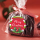 Adicione um toque pessoal às suas cartões de natal com este adesivo de Natal personalizável! O adesivo redondo apresenta um fundo vermelho festivo e uma borda verde e listrada branca. O texto diz "Desejamos-lhe um Feliz Natal" em caracteres elegantes, brancos e cursivos, e pode ser personalizado com o nome ou a assinatura da sua família. Uma ilustração encantadora de folhas e bagas sagradas adiciona o toque perfeito de acabamento. Espalhe a alegria do feriado com este encantador!
