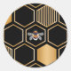 Este design contemporâneo apresenta um padrão geométrico de coloração dourada das colmeias, mamangabas e um fundo preto.