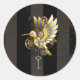 Steampunk, antigo, ouro, beija-flor mecânica com engrenagens de latão e chave prateada em fundo castanho listrado. Pássaro Dourado.
