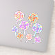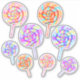 Adesivo com ilustração digital de pirulitos caramelos multicoloridos. Doce redondo espiral em cores rosa, amarelo e azul.