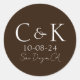 Estas etiquetas de adesivos de casamento personalizadas apresentam uma design simples e moderna. As iniciais do monograma de amostra são colocadas no centro, seguidas de uma data de casamento e de um local. O fundo apresenta uma cor castanha de chocolate escura.