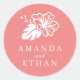 Os adesivos personalizados das ilhas são projetados para combinar com a nossa coleção de convites para o casamento de Island Hibiscus, com os nomes dos casais em elegante cartaz branca com uma flor de hibisco tropical num fundo de coral de verão vibrante.