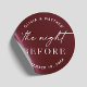 Adicione um toque ousado e romântico ao seu janto de ensaio com este adesivo redondo burgundy com a elegante frase "A Noite Antes". O fundo de vinho tinto é perfeito para o outono e casamentos no inverno, trazendo calor, riqueza e estilo de eterno para a sua celebração pré-casamento. Use-o para selar envelopes, decorar bolsas favoráveis ou personalizar presentes de boas-vindas para seus convidados. Essa cor é lindamente emparelhada com pincel, ouro, marinho ou verde florestal para uma sofisticada paleta sazonal.