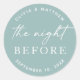 Adicione um toque sereno e elegante ao seu janto de ensaio de casamento com este adesivo verde-redondo azul macio com "A Noite Antes". Perfeito para casais que amam cores modernas e suaves. Com a sua design clássica e minimalista, este adesivo é ideal para selar envelopes, decorar bolsas de favor ou personalizar presentes para a sua celebração pré-casamento. O tom azul-esmalte é muito parecido com uma variedade de temas de casamento, incluindo comemorações formais, náuticas, costeiras ou de inverno de outono.