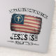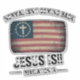 Jesus está voltando, esta design cristã mostra uma bandeira americana com uma cruz e as palavras "normal não está voltando, Jesus está, Revelação 14.