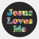 Este adesivo colorido colorido de Santa Fé, retrô clássico, apresenta citações de "Jesus me ama" em um fundo preto.