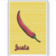 Uma pimenta vermelha de jwala chili, também conhecida como pimenta de um dedo quente indiano, é decorada com padrões inspirados pela médi indiana e se senta sobre um fundo amarelo com uma versão menor do mesmo padrão e uma etiqueta de roteiro no canto. Este pimenta moderadamente picante é utilizado para adicionar calor a curries autênticos e a outra cozinha indiana.