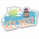 Key West, Flórida, com o contorno da silhueta de um mapa da ilha, o nome Key West, uma palmeira, e o famoso marcador do ponto mais meridional.