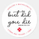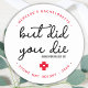 Mas você morreu? Kit de Alívio de Ressaca! Esses adesivos divertidos de favor de despedida de solteira são perfeitos para criar seus próprios kits de recuperação de ressaca para seus convidados, essencial se você planeja ter um fim de semana de meninas fora. Visite nossa coleção de brindes de despedida de solteira, brindes de casamento e brindes de kit de ressaca e lembranças de casamento. Personalize com nome e data. COPYRIGHT © 2020 Judy Burrows, Black Dog Art - Todos os Direitos Reservados. Kit de Alívio de Ressaca Personalizado Mas Você Morreu Adesivo Redondo Clássico