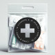 Um adesivo preto e prateado para o Kit de Emergência (também conhecido como Kit Hangover) para colocar em um saco de boas-vindas ao casamento, com algum dentro de remédio. Ele tem uma cruz de folha prateada falsa no centro e o texto arquivado fazer um círculo ao seu redor. Por cima, há a mensagem "Na doença e na saúde" e, por baixo, há os nomes da noiva e do noivo e a data. O texto está em pequenas bonés de cinzas de prata, de cor semelhante à prata falsa da cruz. o fundo é preto.