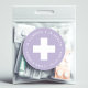 Um adesivo de lavanda para o Kit de Emergência (também conhecido como Kit Hangover) para colocar em um saco de boas-vindas de casamento, com algum dentro de medicamento. Tem uma cruz no centro e um fazer de texto arquivado ao seu redor, ambos brancos. Por cima, há a mensagem "Na doença e na saúde" e, por baixo, há os nomes da noiva e do noivo e a data. O fundo é lavanda (roxo claro).