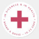 Um adesivo para o Kit de Emergência (também conhecido como Kit Hangover) para colocar em um saco de boas-vindas ao casamento, com algum dentro de remédio. Recomendado para um casamento que tem burgundy como cor de casamento. Tem uma cruz no centro e um fazer de texto arquivado ao seu redor. Por cima, há a mensagem "Na doença e na saúde" e, por baixo, há os nomes da noiva e do noivo e a data. O texto está em pequenos bonés. Tanto a cruz como o texto têm uma nítida cor moderna, entre magenta e vermelho. O fundo é branco.