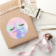 Um adesivo para promover ou marcar seus pertences para um salão de beleza, negócios, maquiagem ou prego. Um fundo holográfico de tendência com cores unicórnicas e cores arco-íris em rosa, roxo, rosa, verde-menta. Decorado com pingos de brilho sujo em rosa dourado, rosa e roxo e lascas oculares pretas. Personalize e adicione seu nome, endereço e informações de contato.