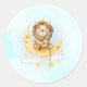 Vinhetas com uma ilustração de aquarela fofa. Um adorável leão vestindo uma coroa pescando estrelas sentadas em uma lua crescente descansando em uma nuvem fofinha. Ilustração de fantasia mágica. Fundo de aquarela azul claro.