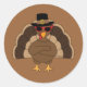 Legal Turquia, graças à vinheta-redonda castanha-redonda, com fornecimento de molho. Engraçado Brown, com pássaro na moda vermelho e chapéu preto cruzando braços e desejando Feliz Ação de Graças.