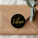 Um adesivo divertido e único com letra cursiva dourada sobre preto, feito sob medida para você para uma festa de compromisso. Ele apresenta a palavra "comprometidos" em dourado com anéis de casamento dourados sobrepostos. Abaixo e acima disso estão os nomes da noiva e do noivo e a data do compromisso.