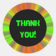 Adesivos "Obrigado" redondos personalizáveis com texto brilhante de verde limão. A arte digital que a acompanha apresenta um desenho fractal neon fluorescente, cor de laranja, verde e abstrato amarelo, mas você pode adicionar sua própria foto ou imagem. O círculo preto fornece uma área no design para adicionar texto personalizado. Personalize o estilo, o tamanho e a cor da fonte, conforme necessário, para sua mensagem de texto personalizada.