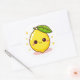 Léon amarelo giro e feliz com grandes olhos redondos e sorriso feliz. Uma folha verde solteiro no topo da cabeça dela, com muitas faíscas e uma sombra rosa.