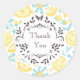 Uma obrigado que você cola com as palavras dentro a um quadro decorativo decorativo de rico circular. O fundo é desenhado com um padrão fino e fofo composto por limões amarelos e flores azuis pastéis num estilo ilustrado desenhado à mão.