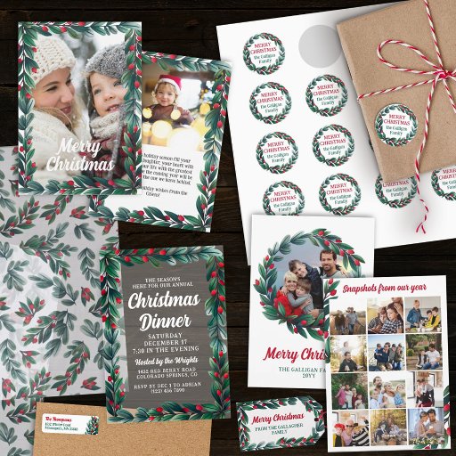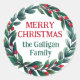 Feliz Natal do adesivo com uma bela coroa de Natal com verde e bagas personalizadas com seu nome familiar. A coroa de natal, com um adesivo de Natal em verde e vermelho, com uma coroa de morango.