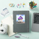 Pau numa pequena cabana de praia/casa de férias em pernas, pintada de branco e roxo, na areia, com céu azul e nuvens brancas