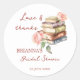 Livro de histórias novo capítulo chá de panela impresso obrigado você favorece autocolantes modelo tabuleiro personalizado, livros lendo sobre o tema chuveiro nojento autocolante personalizado apresentação de favor, pilha aquarela de livros e blush rosa letra de letra de letra de chá de panela casual para livrarias