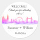 Londres, Inglaterra, linha do horizonte do Reino Unido é uma pintura de aquarela original da artista Monika Howarth Wedding favorece adesivos. Londres, Westminster, casas do parlamento, ponte de Londres. Pintura rosa com tipografia negra. Personalize-o com seus detalhes.