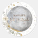 Favor elegante e / ou selo de envelope Adesivo de Bat Mitzvah com belo design de lua e estrelas celestiais em aquarela, coordenando com o convite de "Chic Celestial Silver, White and Gold Bat Mitzvah". Mesmo design do verso do convite. Estrelas delicadas, frase Bat Mitzvah e detalhes de lua nos cantos em folha de ouro falsa. Personalize este design com seu próprio nome. Ideal para um tema celestial prateado e dourado ou branco e dourado! Parte da nossa coleção "Estrelas e Lua Celestiais Brancas, Douradas e Prateadas" com uma variedade de produtos disponíveis. Visite a coleção completa em: https://www.zazzle.com/collections/gold_white_and_silver_celestial_stars_and_moon-119446192561160871