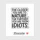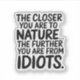 Fuja do corre-corre e abrace a tranquilidade da natureza com este adesivo espirituoso! Com a frase "Quanto mais perto você está da natureza... Mais longe você está dos idiotas", este adesivo é perfeito para entusiastas de atividades ao ar livre, introvertidos ou qualquer pessoa que prefira a companhia das árvores às pessoas. Cole-o no seu laptop, garrafa de água, equipamento de caminhada ou em qualquer lugar que você queira expressar seu amor pelo mundo natural e um toque de humor sarcástico. Este adesivo de vinil durável foi feito para resistir às intempéries, assim como seu espírito aventureiro.