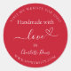Um fundo na moda vermelho, texto branco. Personalize e adicione seu nome e seu URL/link do site. Com o texto: Feita com amor, por + um pequeno coração.