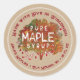 Pure Maple Syrup está escrito em um colorido mapa de outono com pequenos corações caindo da árvore como folhas de outono. O texto editável diz "Made with Love in (your state). Adicione o nome, o local e o volume da sua empresa. Fundo Kraft, borda branca.
