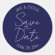 Decorar o seu casamento Guarde os envelopes de Data com estes adesivos redondos que apresentam uma cor azul marinho e um roteiro branco e estilizado. Personalize seus adesivos substituindo nomes de noivas e noivos e data de casamento por seus. Selecione entre um estilo mate ou brilhante.