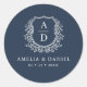 Adicione um toque de sofisticação ao seu casamento com o Marinho Blue Crest Modern Monograming Wedding Classic Round Sticker. Apresentando um fundo azul marinho profundo, um design de crista refinado, e um monograma personalizado, este adesivo é perfeito para aprimorar seus convites de casamento, favores ou papelaria. Seu estilo elegante, porém moderno, o torna uma escolha ideal para casais que buscam um tema de eterno, na moda e casamento clássico.