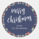 Esta design apresenta um adesivo de natal Feliz com um guião de caligrafia de Natal com uma diversão fantástica simples, um guião de caligrafia sinusética, vermelho de inverno e xadrez verde, uma etiqueta de presente de Natal, uma casa de campo de vintagem rustica, com um padrão de xadrez de Natal rústico, uma embalagem de doces de Natal, com modelo personalizada personalizada, com letra branca