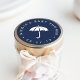 Fale os convites para o chuveiro do seu bebê ou favoritos com esses adesivos bonitos em azul marinho, apresentando uma ilustração de guarda-chuva branca com texto circular para personalizar com o nome do convidado de honra e a data do chá de fraldas.